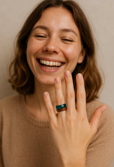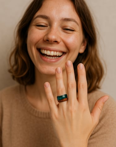 ”Mein Epoxi-Holz-Ring ist einfach traumhaft! Das warme Holz und das klare Harz harmonieren perfekt – im Epoxi wirkt es, als wäre eine kleine Welt eingefangen. Wunderschön verarbeitet, angenehm zu tragen und schon oft bewundert! ”